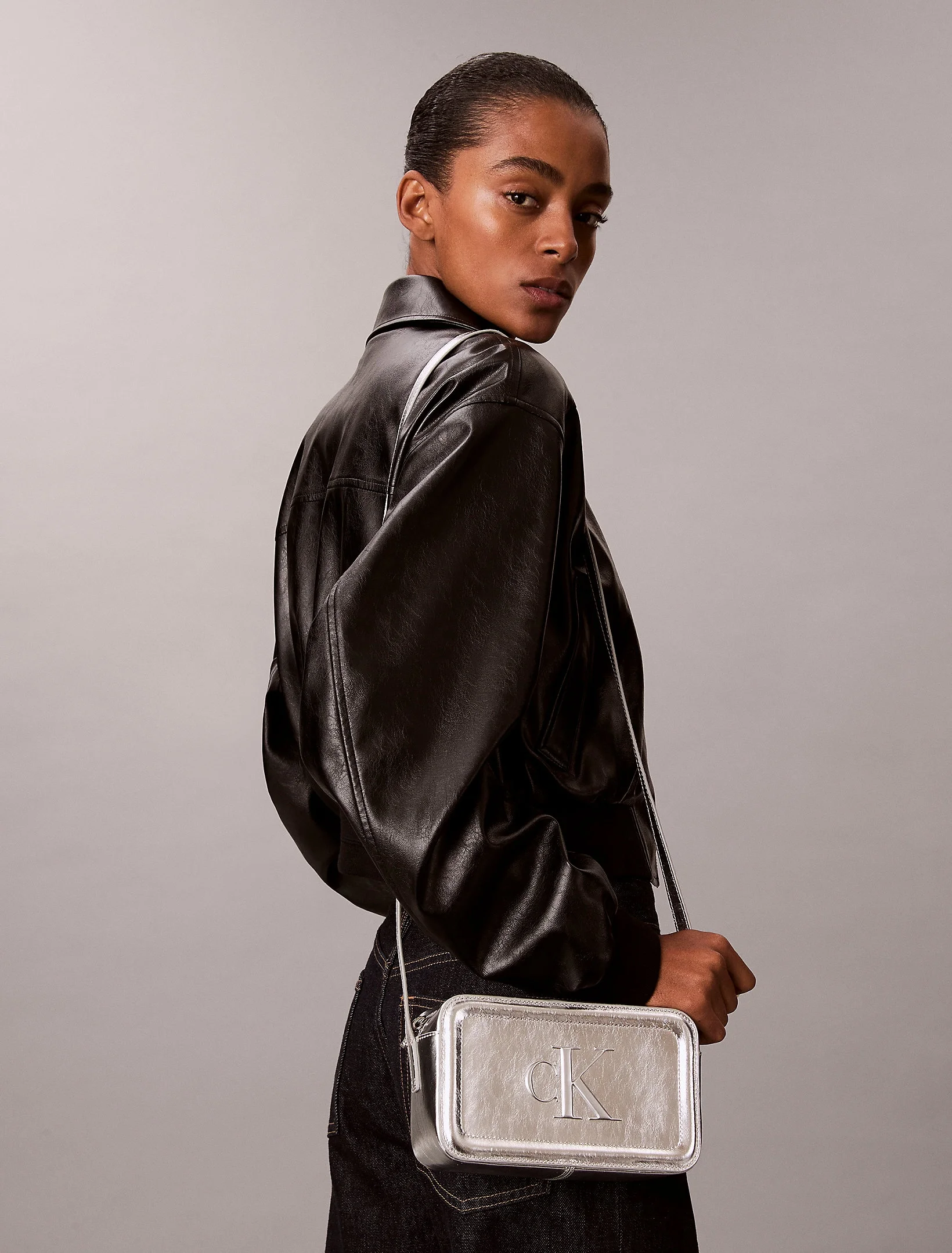 - Bold CK Logo Vurgusu: Ön yüzeyde yer alan büyük ve kabartmalı metalik "CK" amblemi ile markanın prestijli ve modern kimliğinin altını çizer.