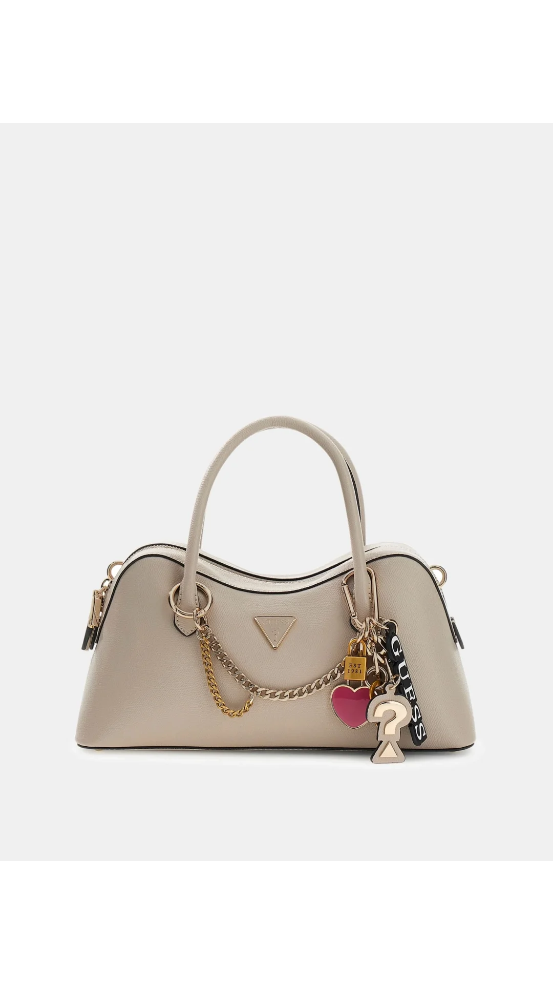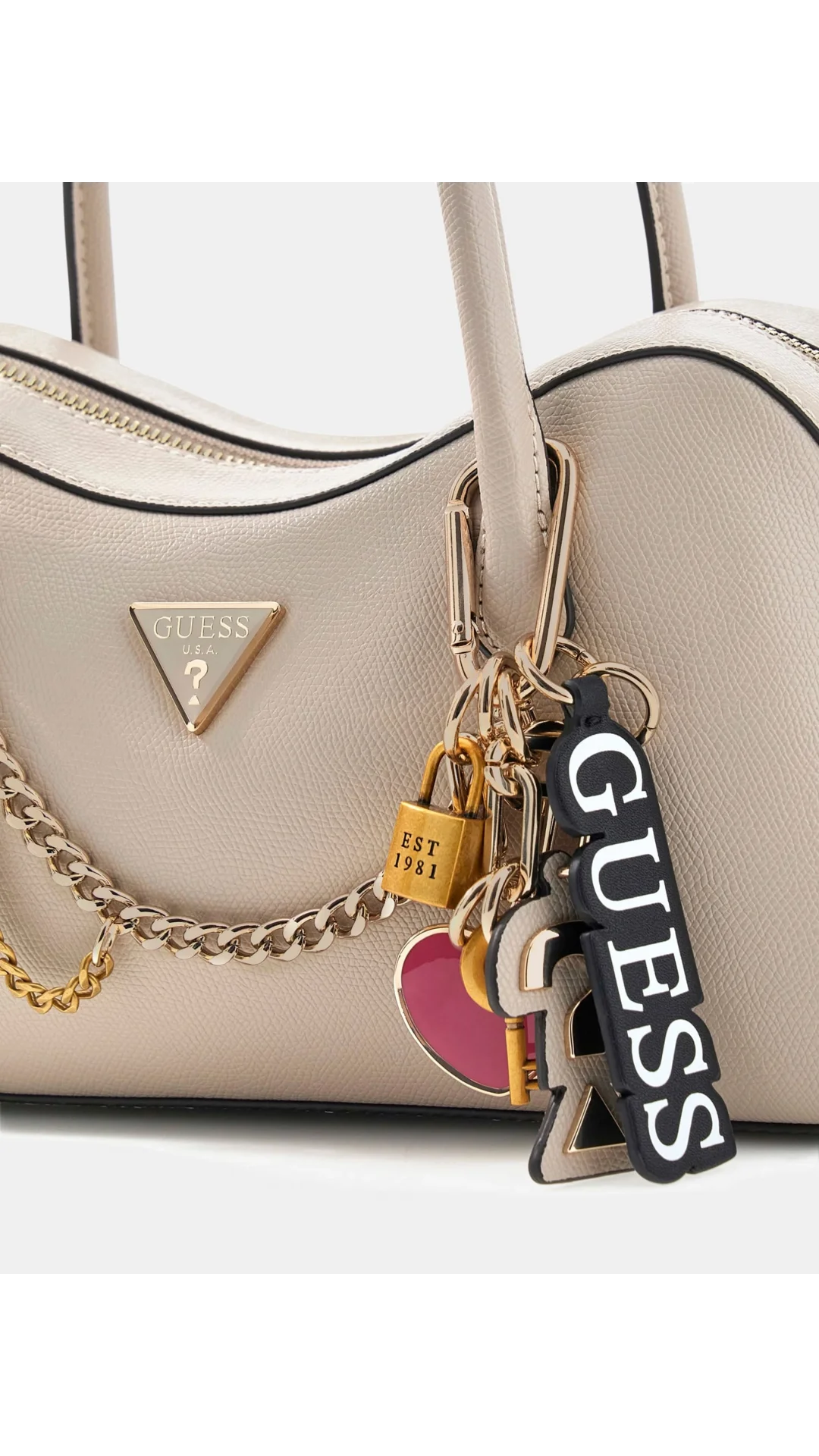 • Karakteristik Detaylar: Ön tarafta yer alan metalik üçgen Guess logosu ve yan kısımdaki logolu anahtarlık eklentisi.