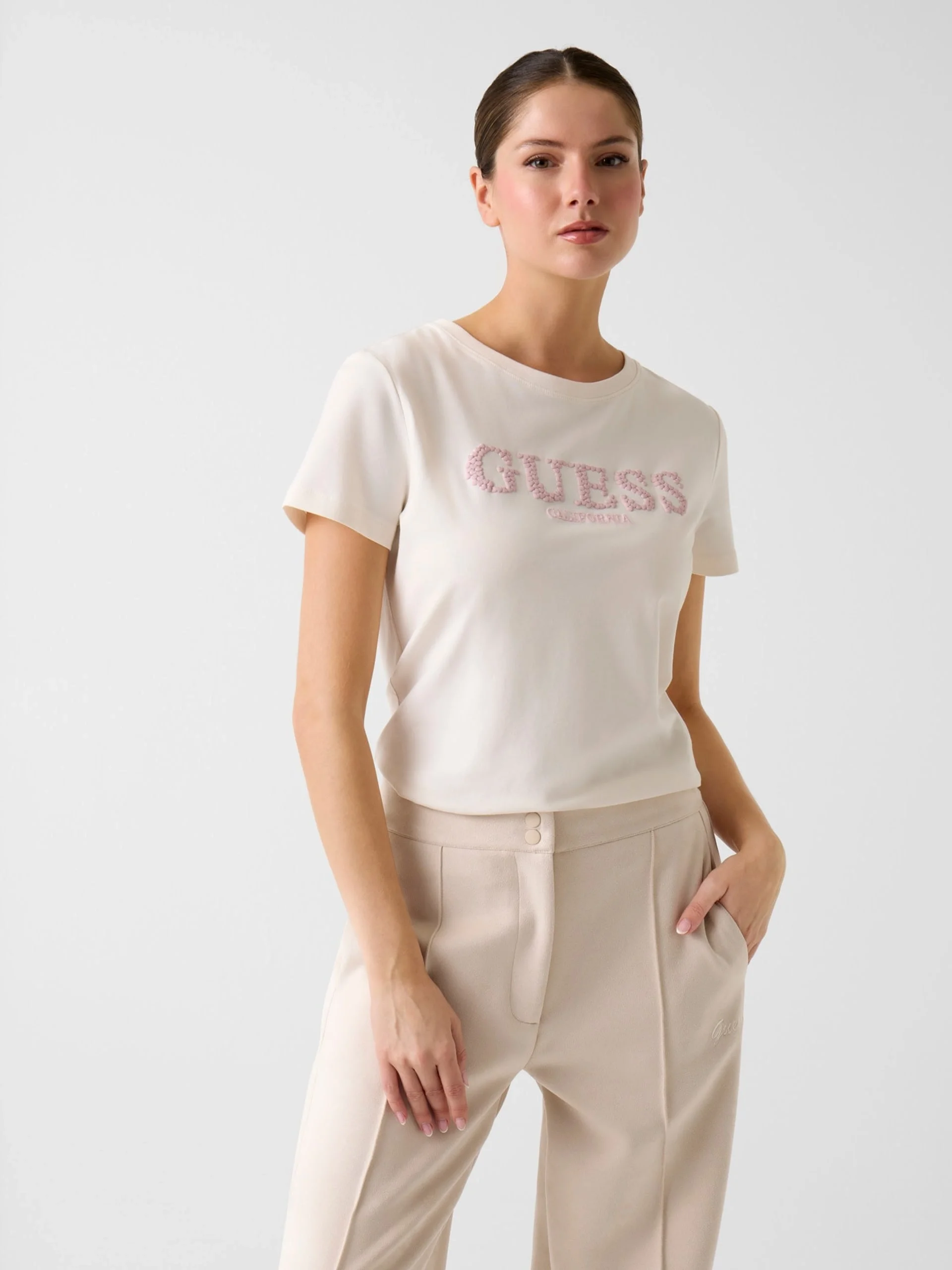 Giuditta Serisi Işıltısı: Giuditta koleksiyonu, Guess’in klasik logo tasarımını genellikle kristal taşlar, payetler veya metalik detaylarla yeniden yorumlamasıyla bilinir. Bu modelde yer alan ışıltılı logo detayı, t-shirt'ü sıradan bir basic olmaktan çıkarıp bir gece şıklığına dahi uyum sağlayacak seviyeye taşır.