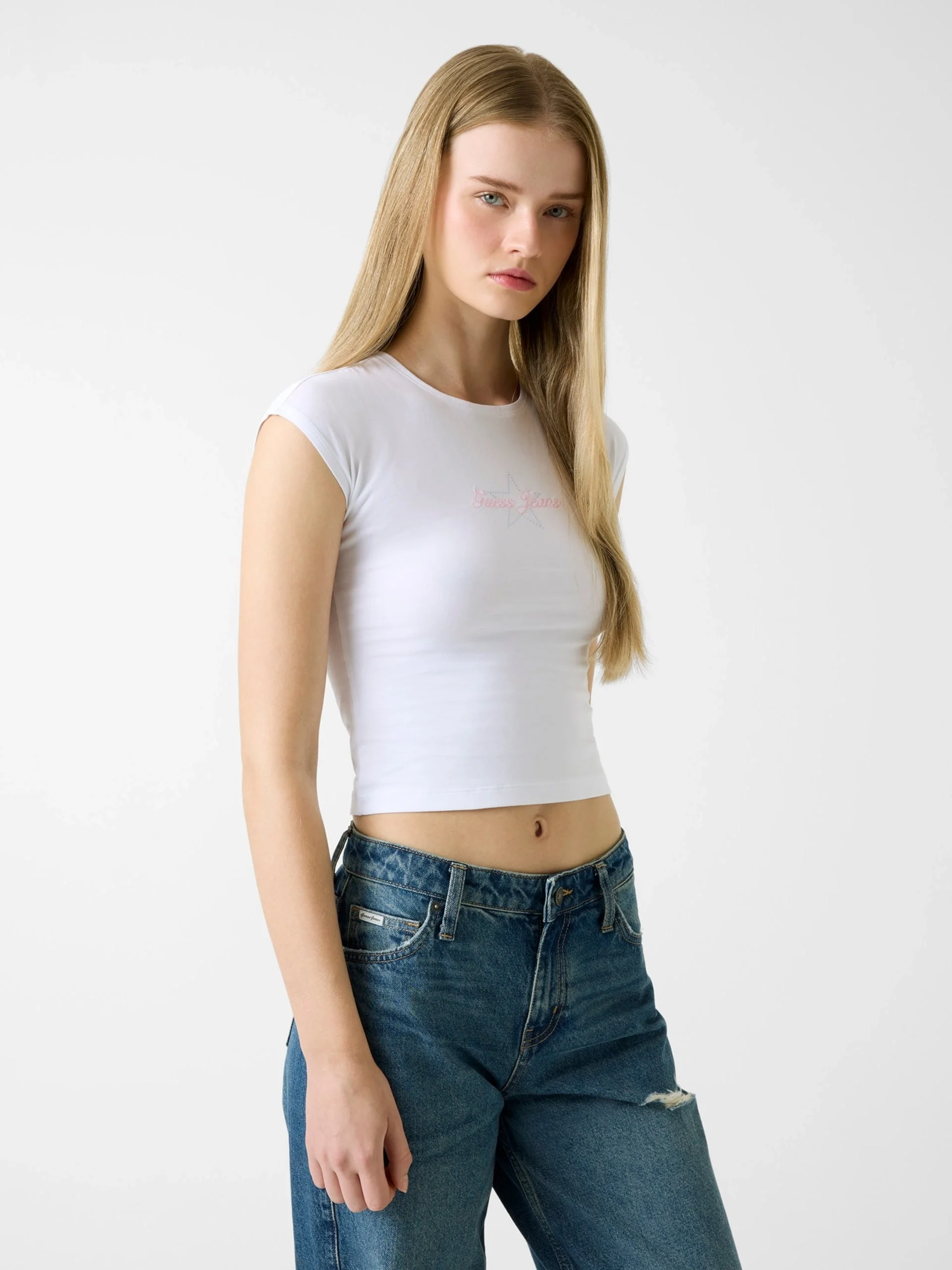 Guess GJ Kısa Kollu Reglan Yıldızlı Baby Kadın Beyaz T-shirt W6RI21J1314-G011, Guess'in genç ve dinamik "Baby Tee" akımını yansıtan, nostaljik 90'lar esintili bir parçadır. G011 (Optik Beyaz) rengi üzerine işlenen yıldız detaylarıyla hem tatlı hem de asi bir stil sunan bu model, vücuda oturan kesimiyle modern bir silüet çizer. Bu ikonik tişört, faturalı olarak Docca güvencesiyle sunulmaktadır.