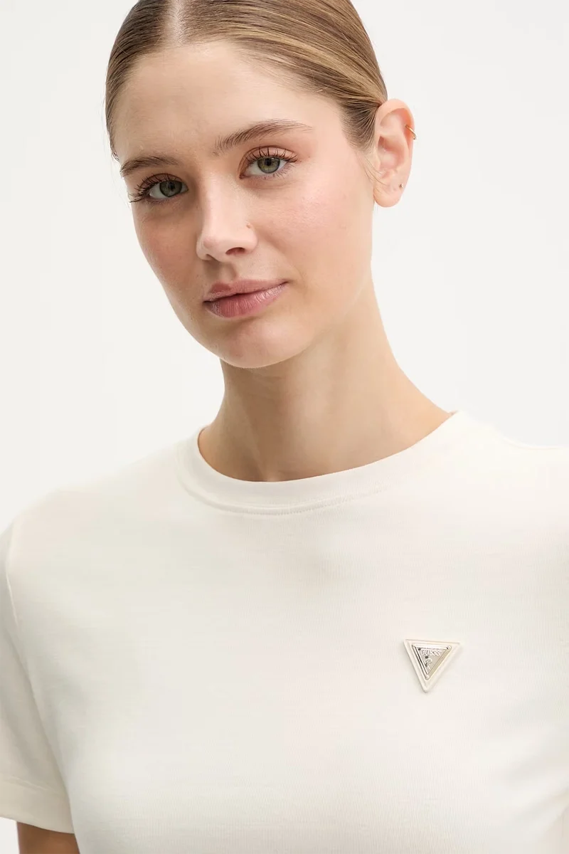 • İkonik Marka İmzası: T-shirt üzerinde yer alan Guess detayı (genellikle taşlı, baskılı veya işlemeli logo varyasyonu olarak), markanın prestijli mirasına zarif bir atıfta bulunur.