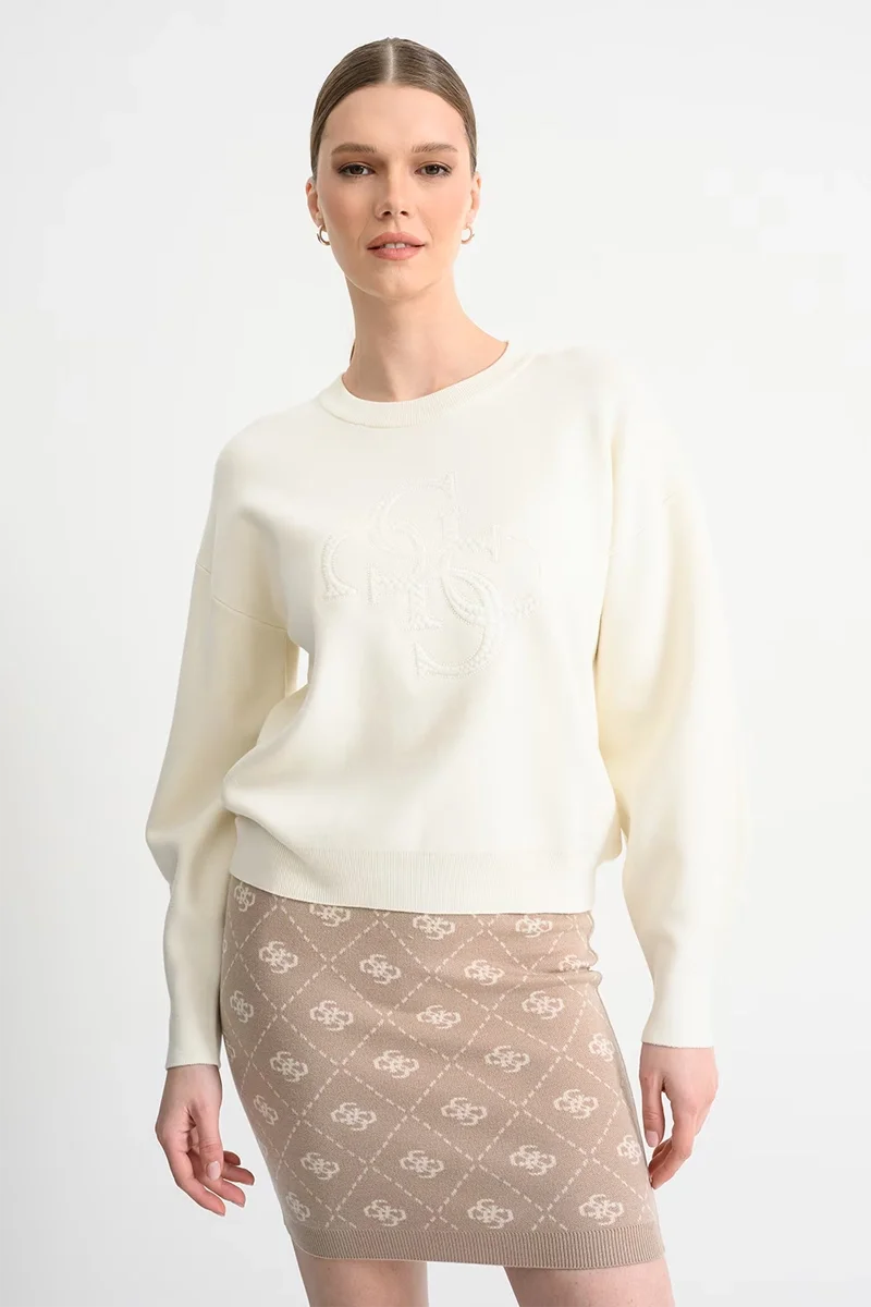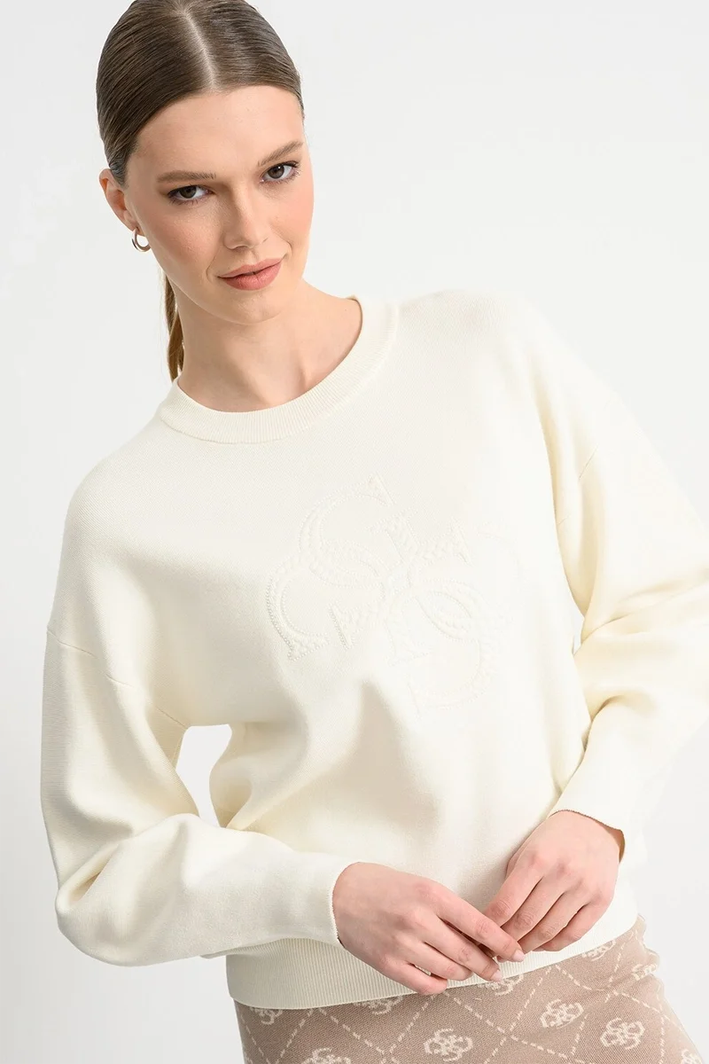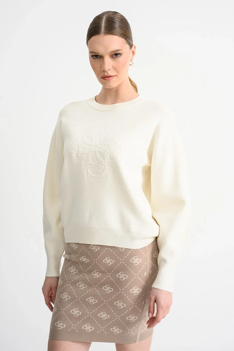 Guess Uzun Kollu Bisiklet Yaka Parker 4G Logolu Triko Kadın Beyaz Triko W6RR48Z26I2-G047