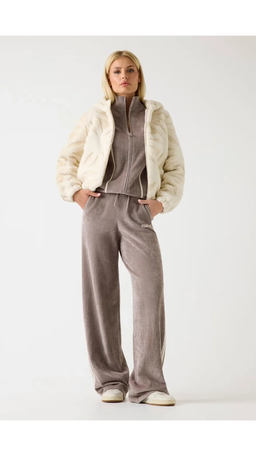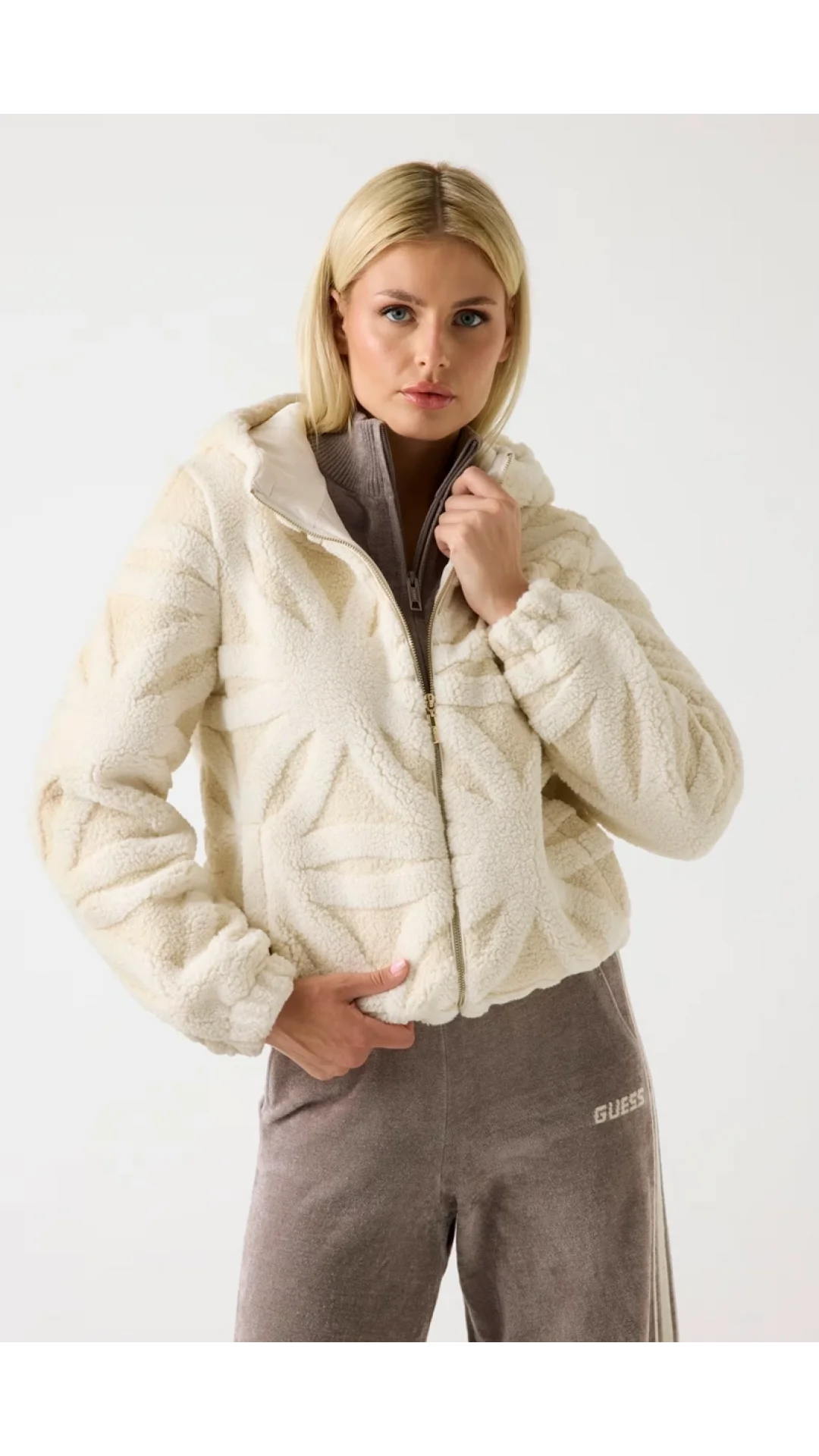 Modern tasarımı ve zarif dokusu ile dikkat çeken Guess Jacquard kadın beyaz aktif bomber ceket, sportif görünümü feminen detaylarla birleştirir. Günlük şehir tarzını tamamlayan bu parça, konforlu kesimi ve yumuşak jacquard dokusuyla dört mevsim şıklık sunar.