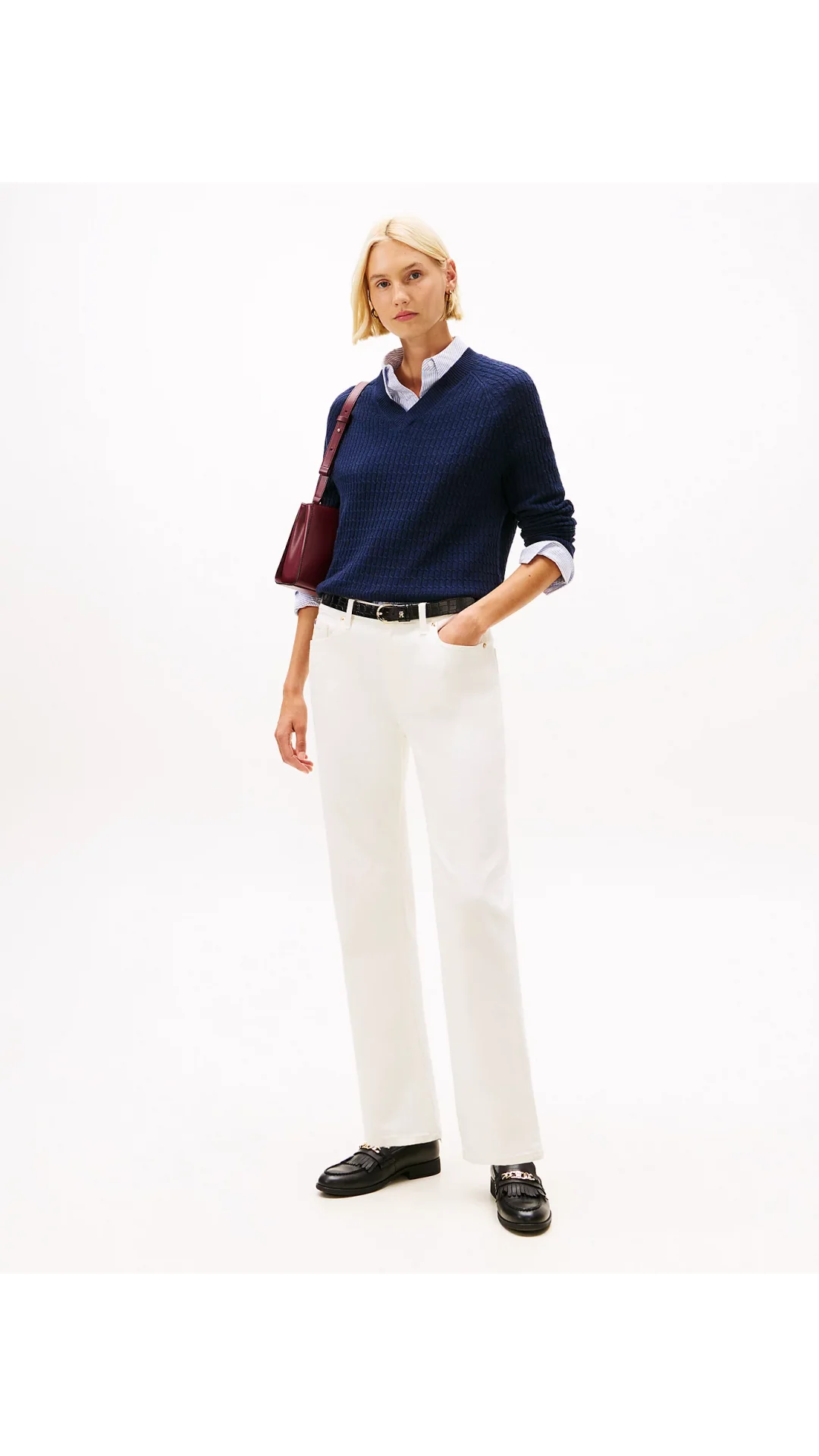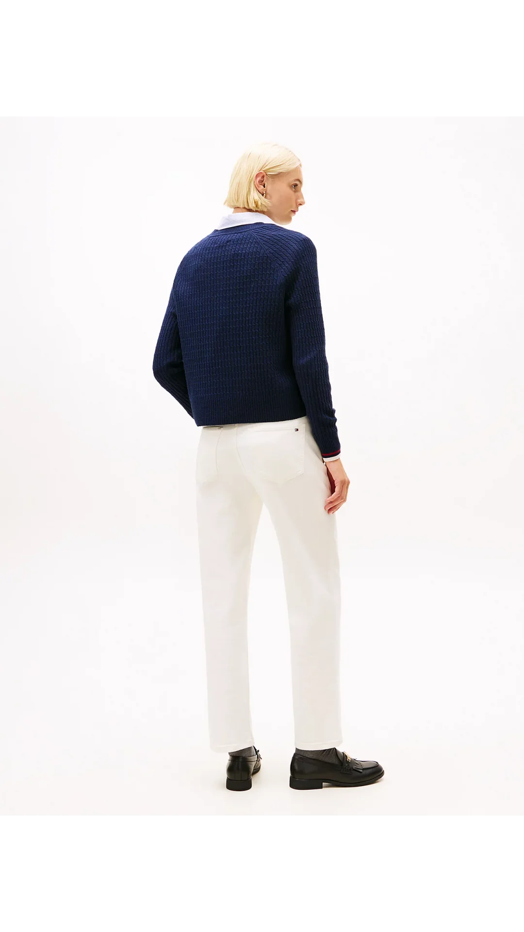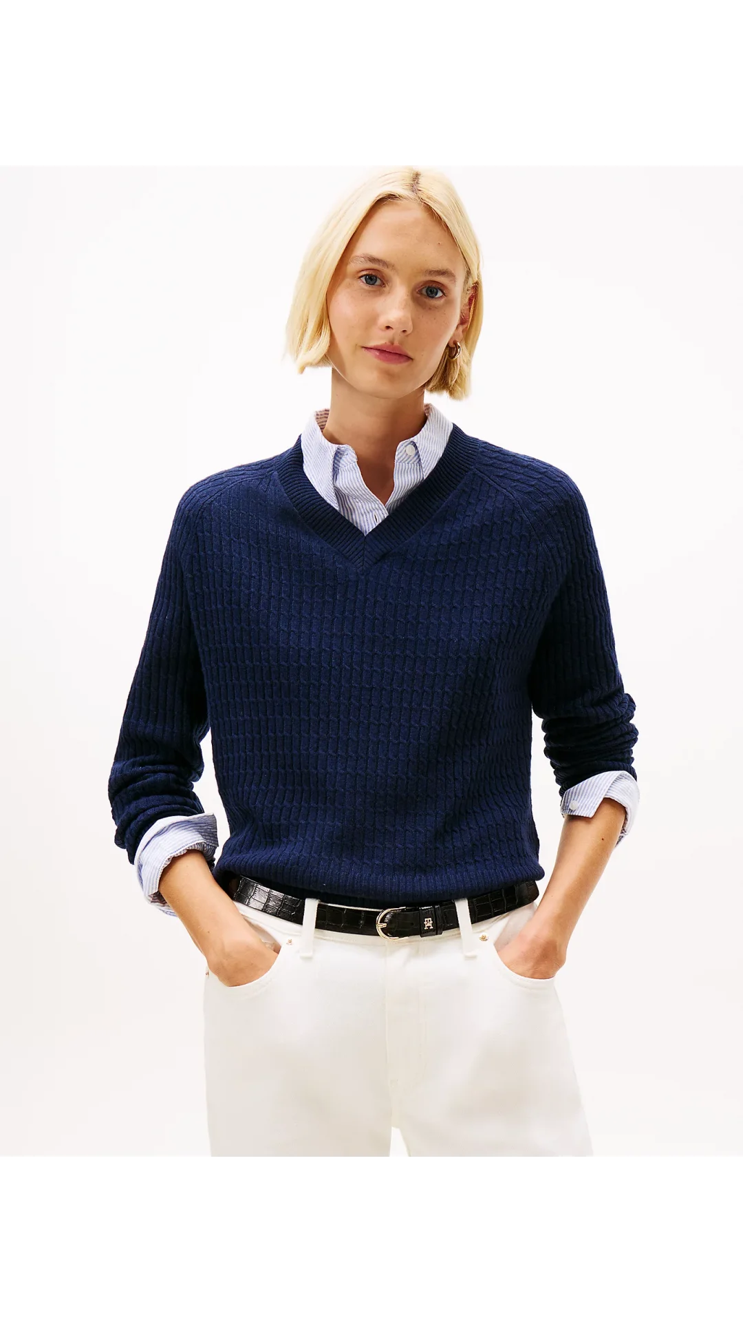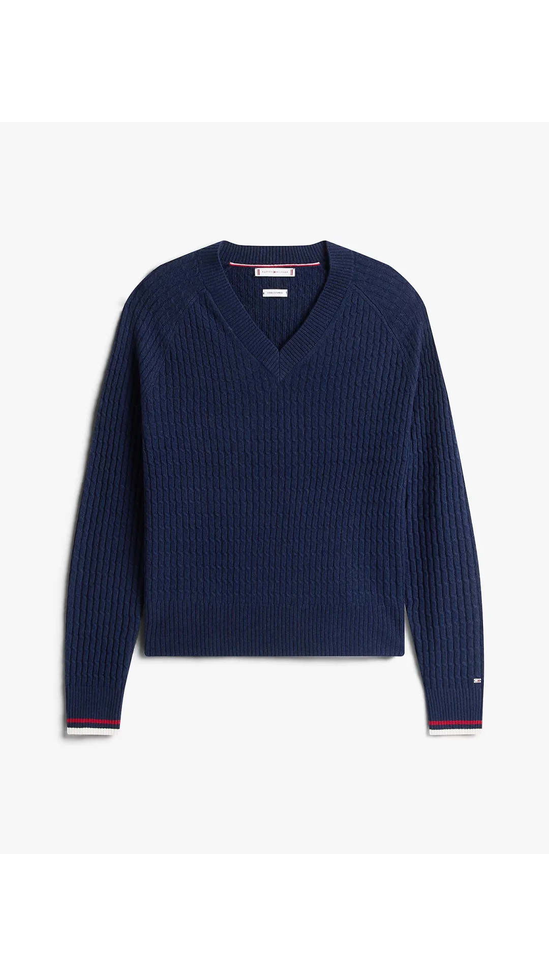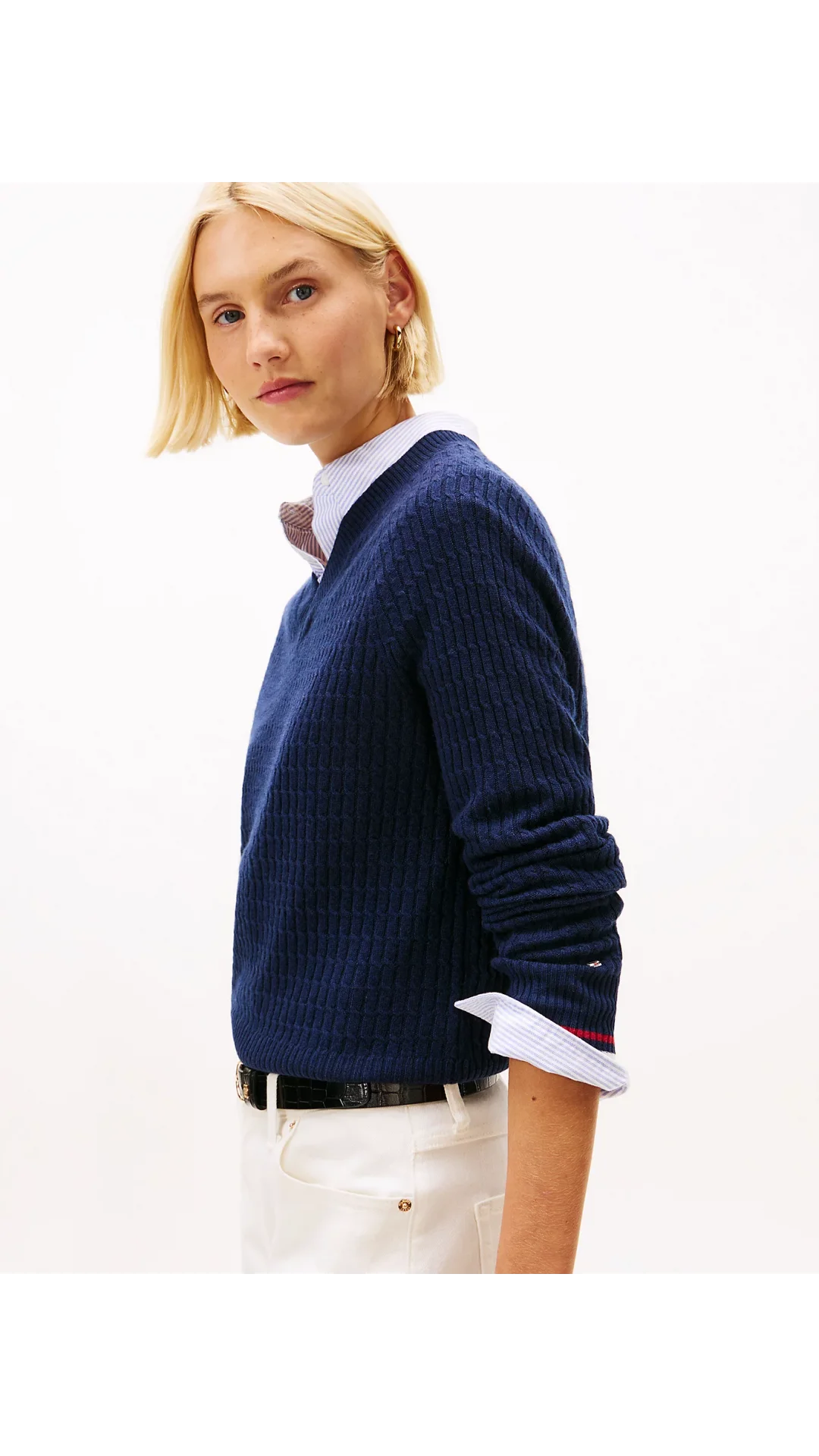 Tommy Hilfiger Yün Kaşmir Karışımlı Saç Örgülü V Yaka Uzun Kollu Kadın Mavi Kazak WW0WW464170Z0