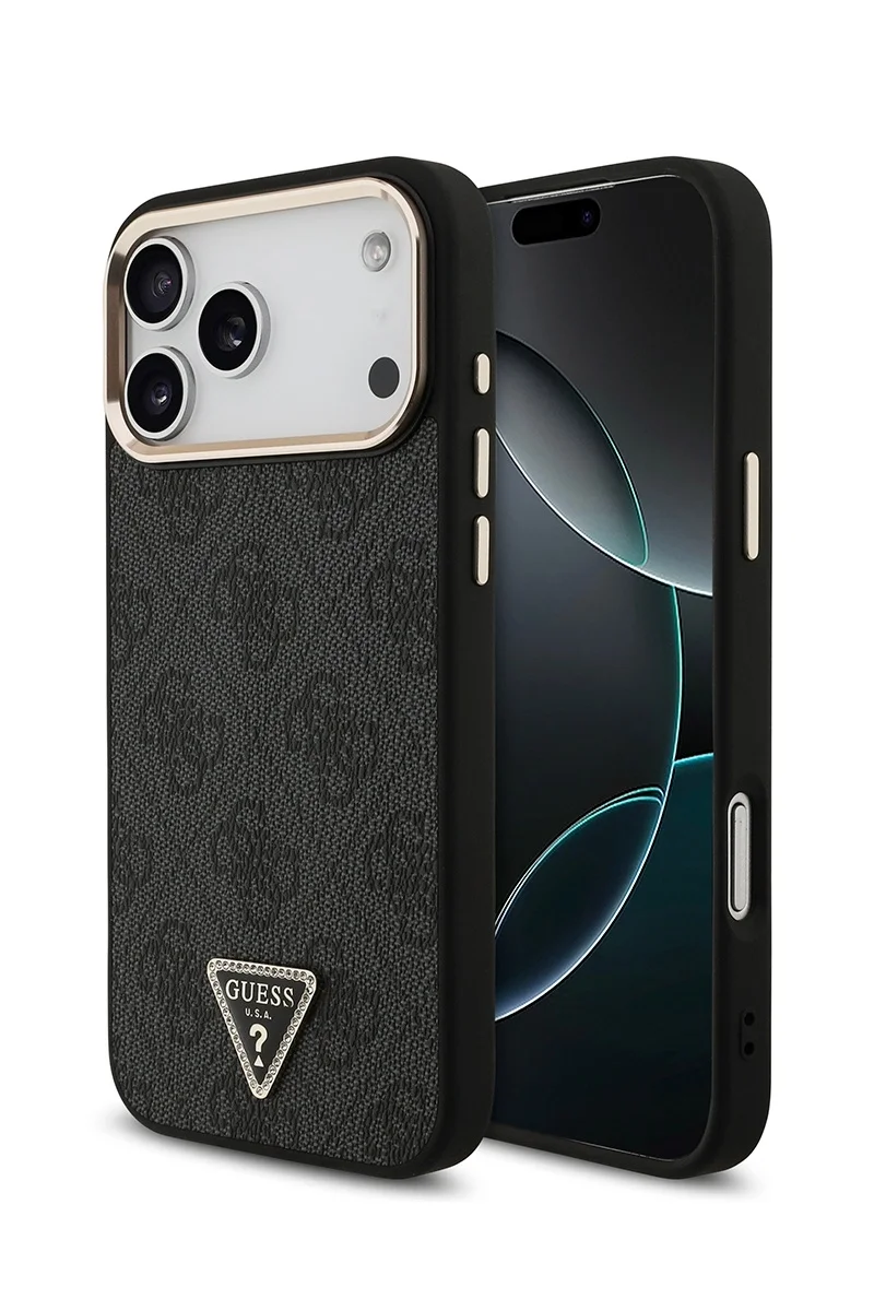 Guess MagSafe 4G PU Üçgen Logolu Altın Detaylı Siyah iPhone 17 Pro Max Kadın Siyah Telefon Kılıfı GUHMP17XP4GTDGMK