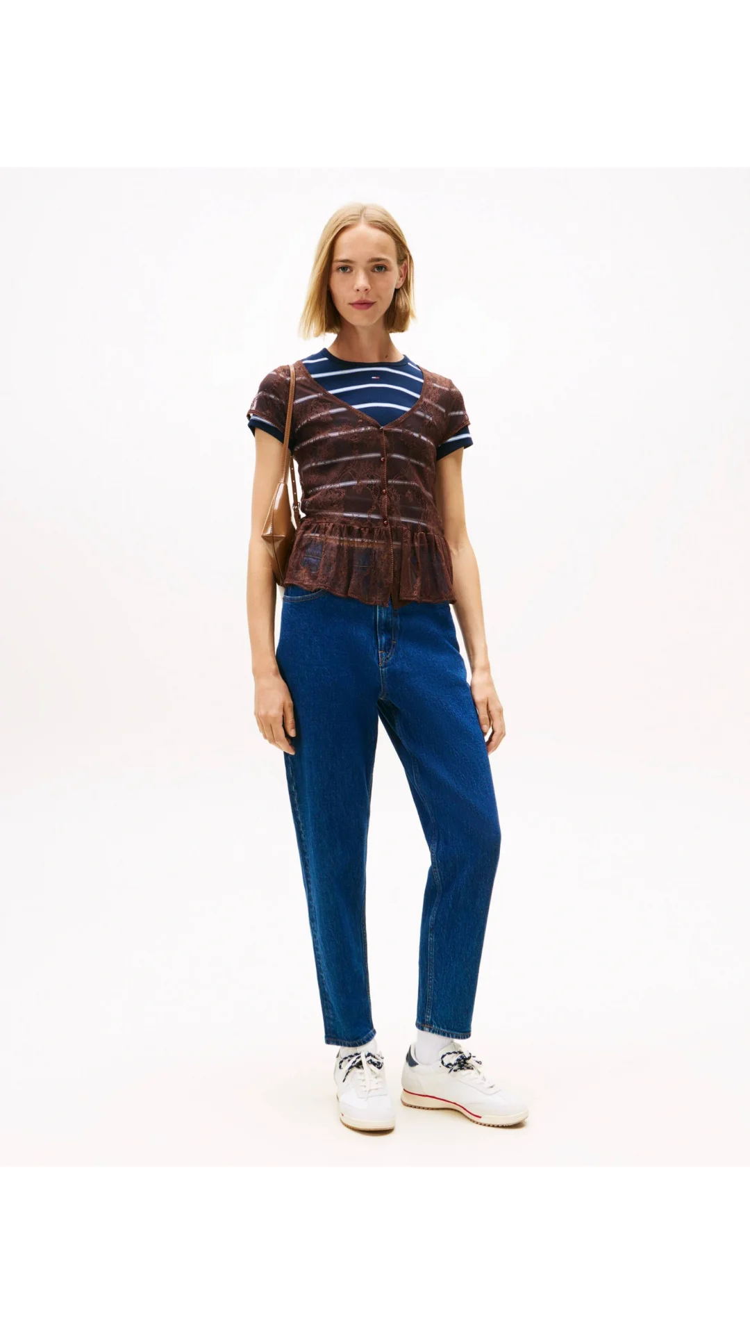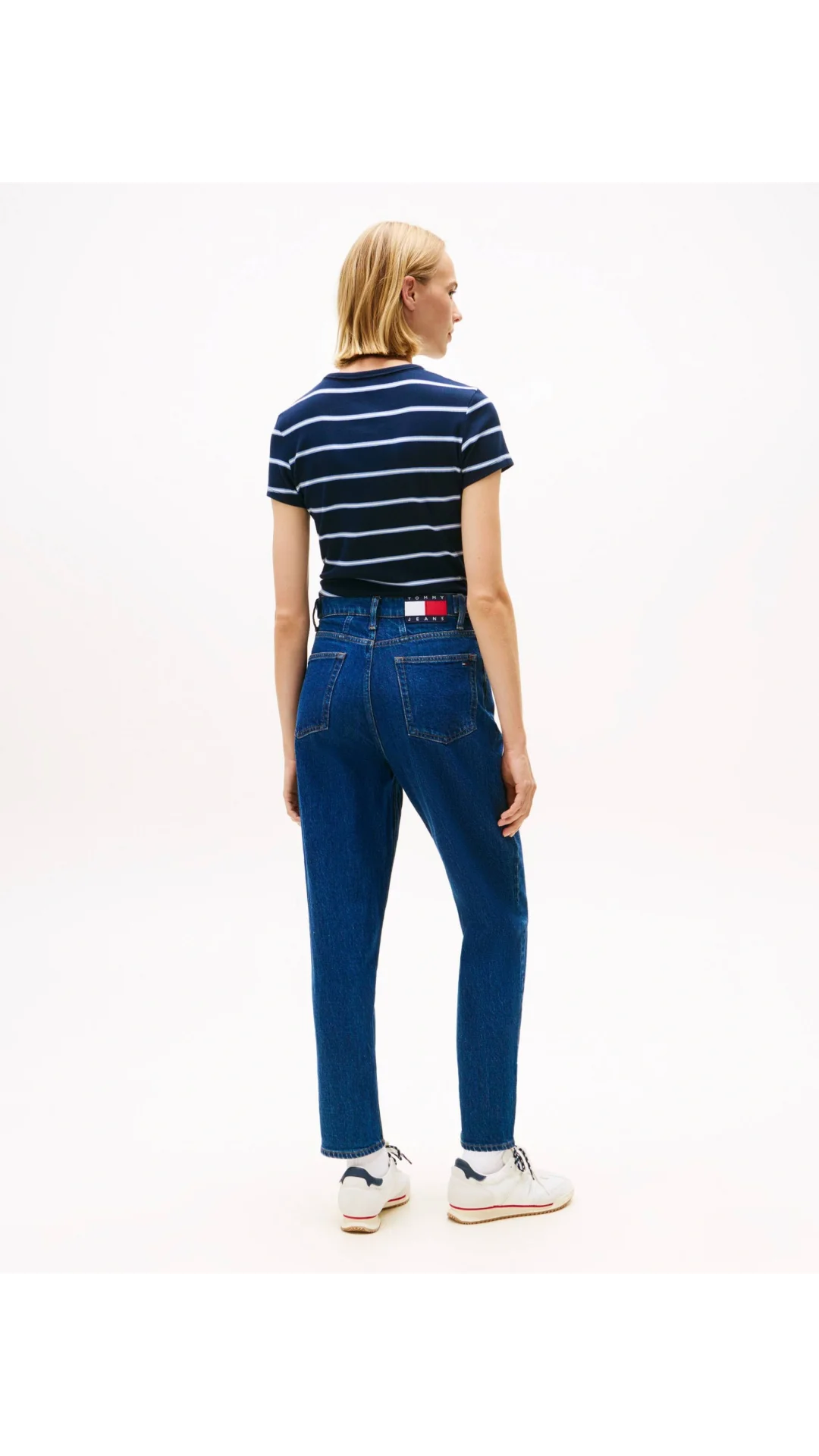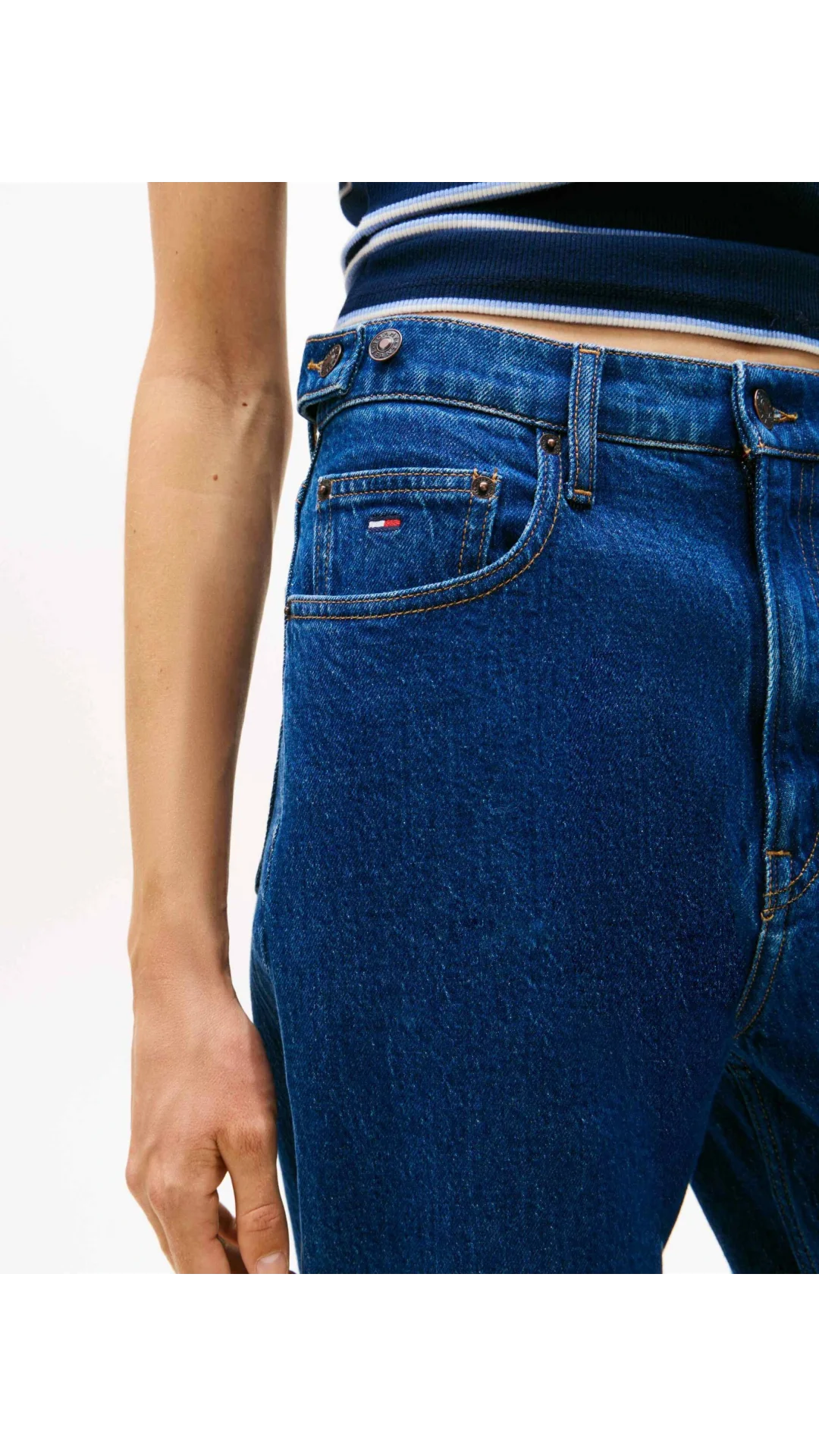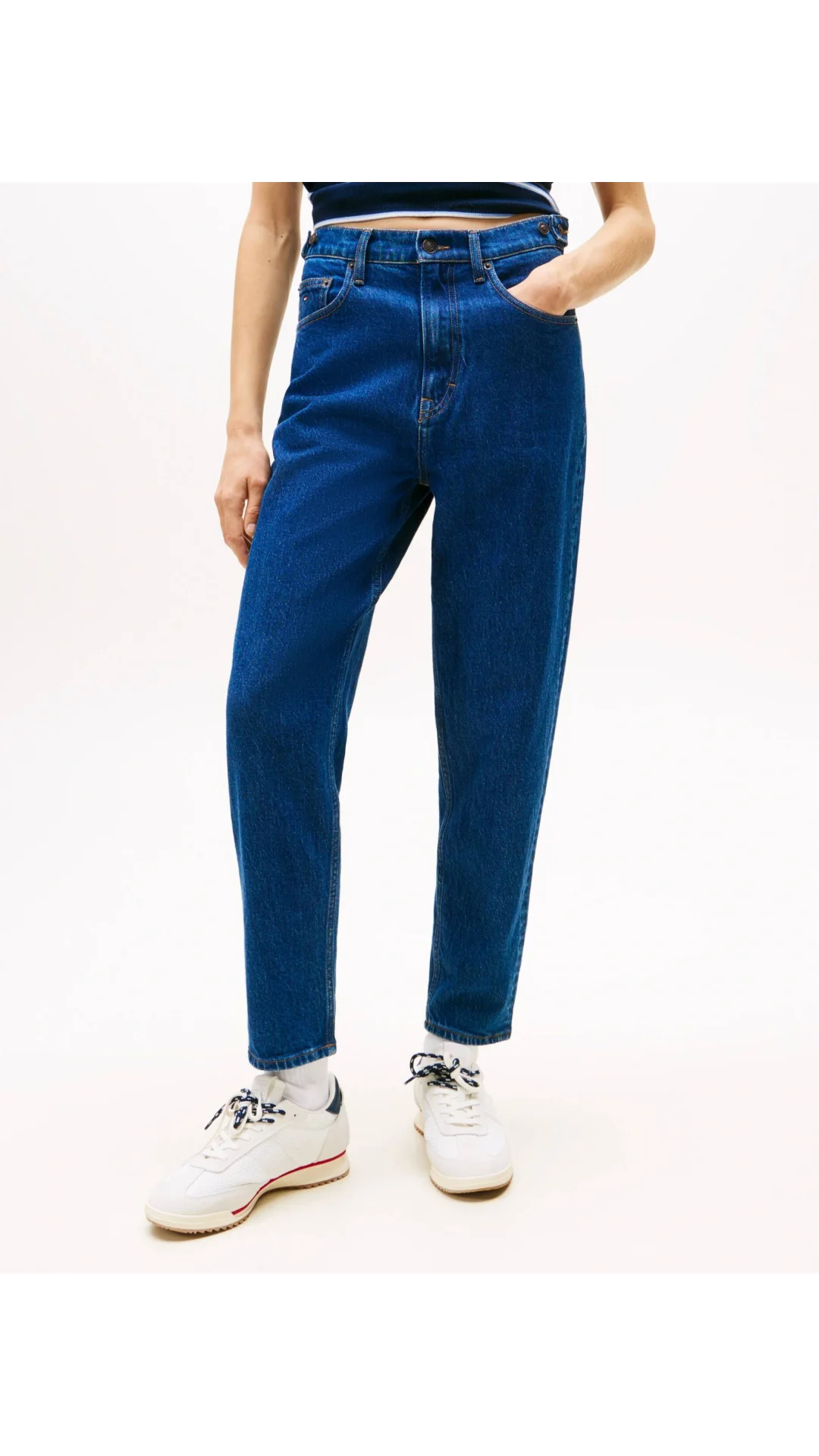 Tommy Hilfiger’ın modern kesimli Mom Jeans modeli, ultra yüksek beli ve bileğe doğru daralan tasarımıyla hem şık hem de rahat bir görünüm sunar. Günlük kombinlerinizi tamamlayacak klasik mavi tonu ve kaliteli kumaşı ile öne çıkar.