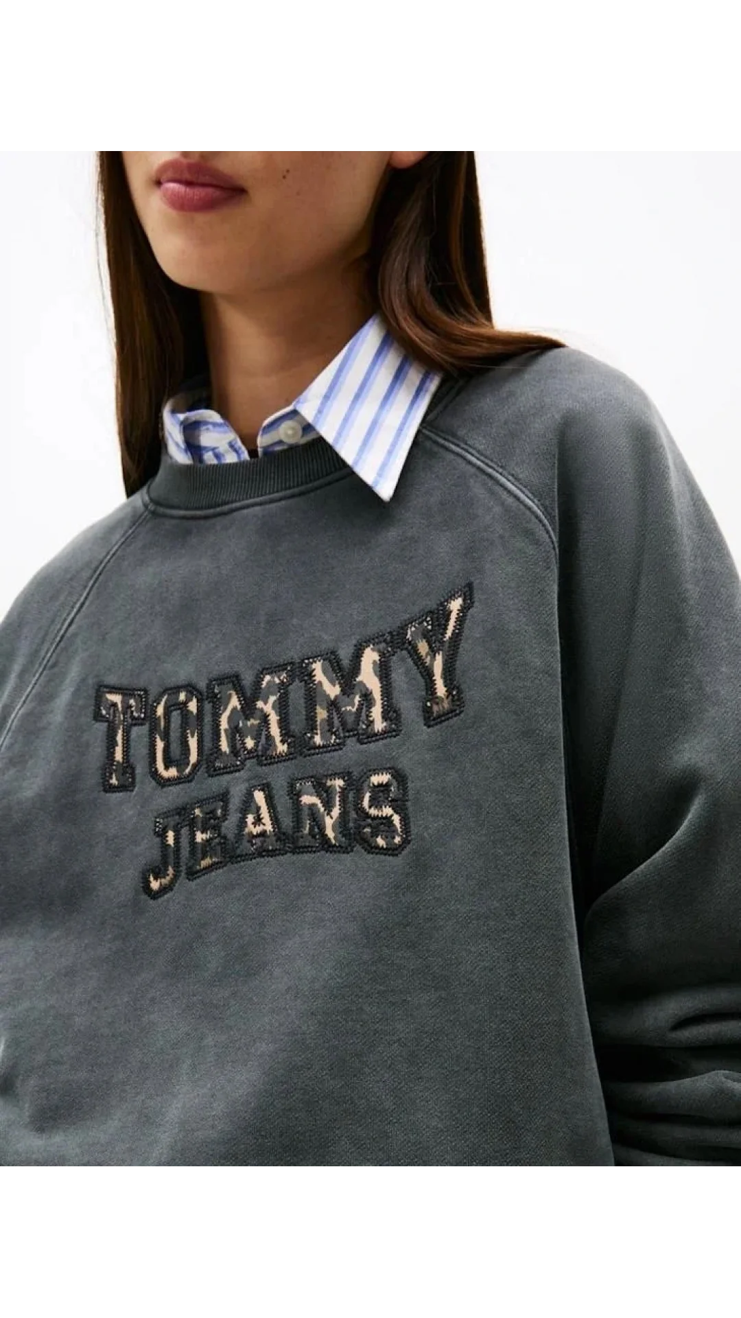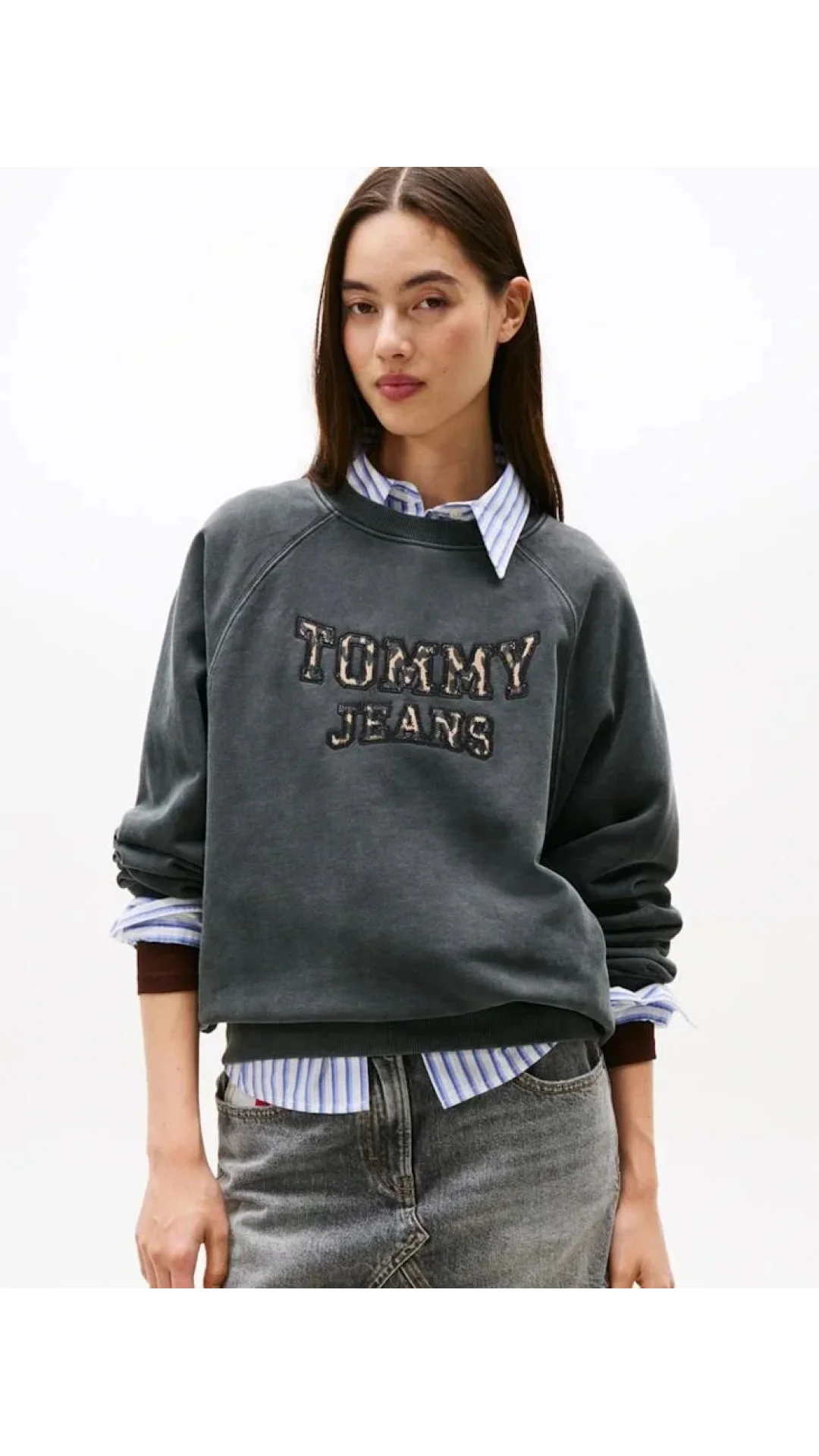 Tommy Hilfiger TJW Kutu Kesim Leopar Desenli Kolej Stili Bisiklet Yaka Kadın Siyah Kazak DW0DW21959BDS