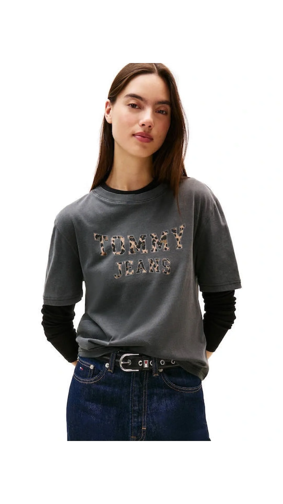 Tommy Hilfiger TJW Kutu Kesim Leopar Desenli Kolej Stili Kadın Siyah T-shirt DW0DW21957BDS
