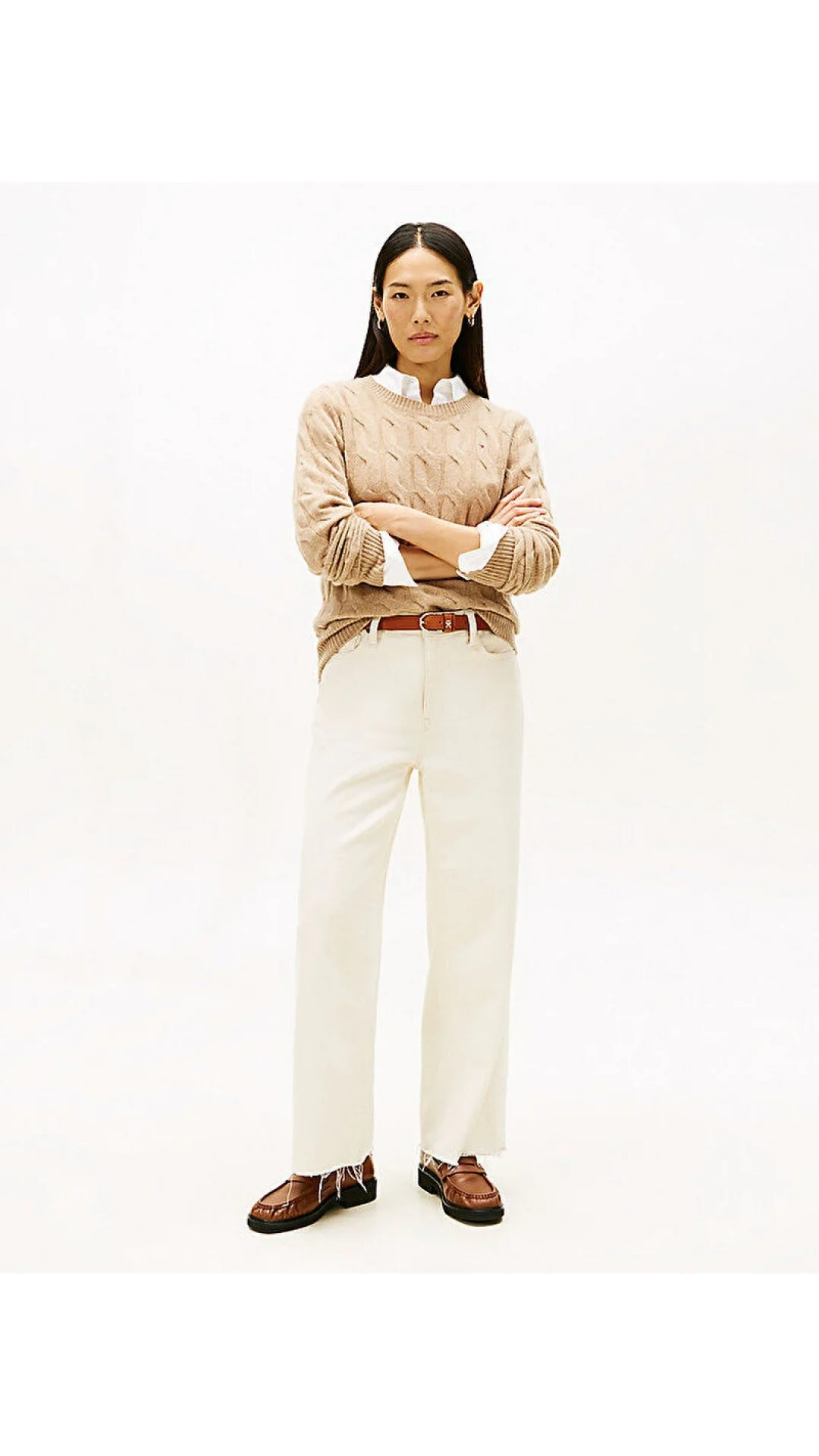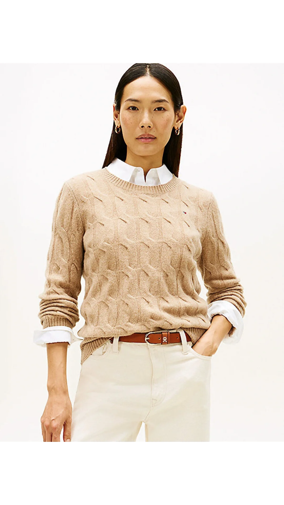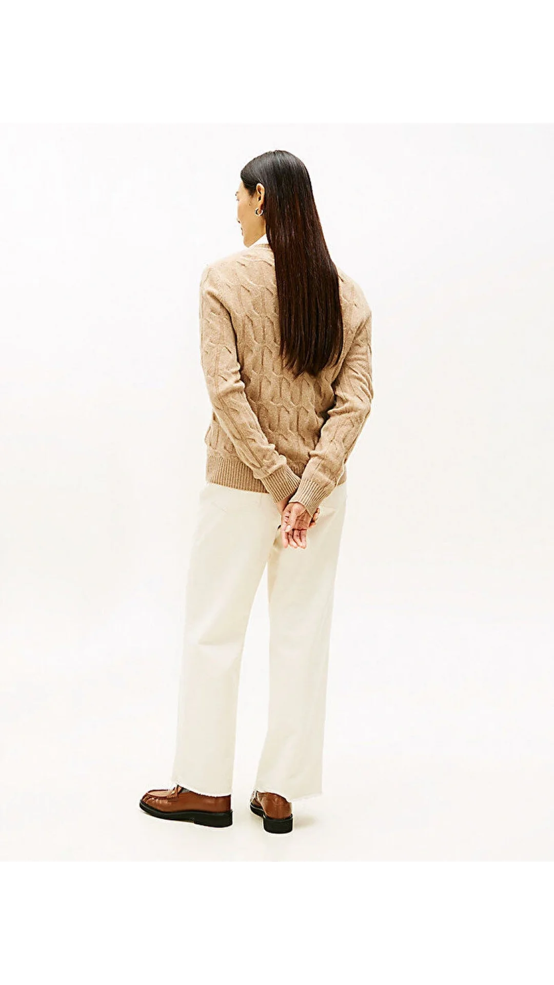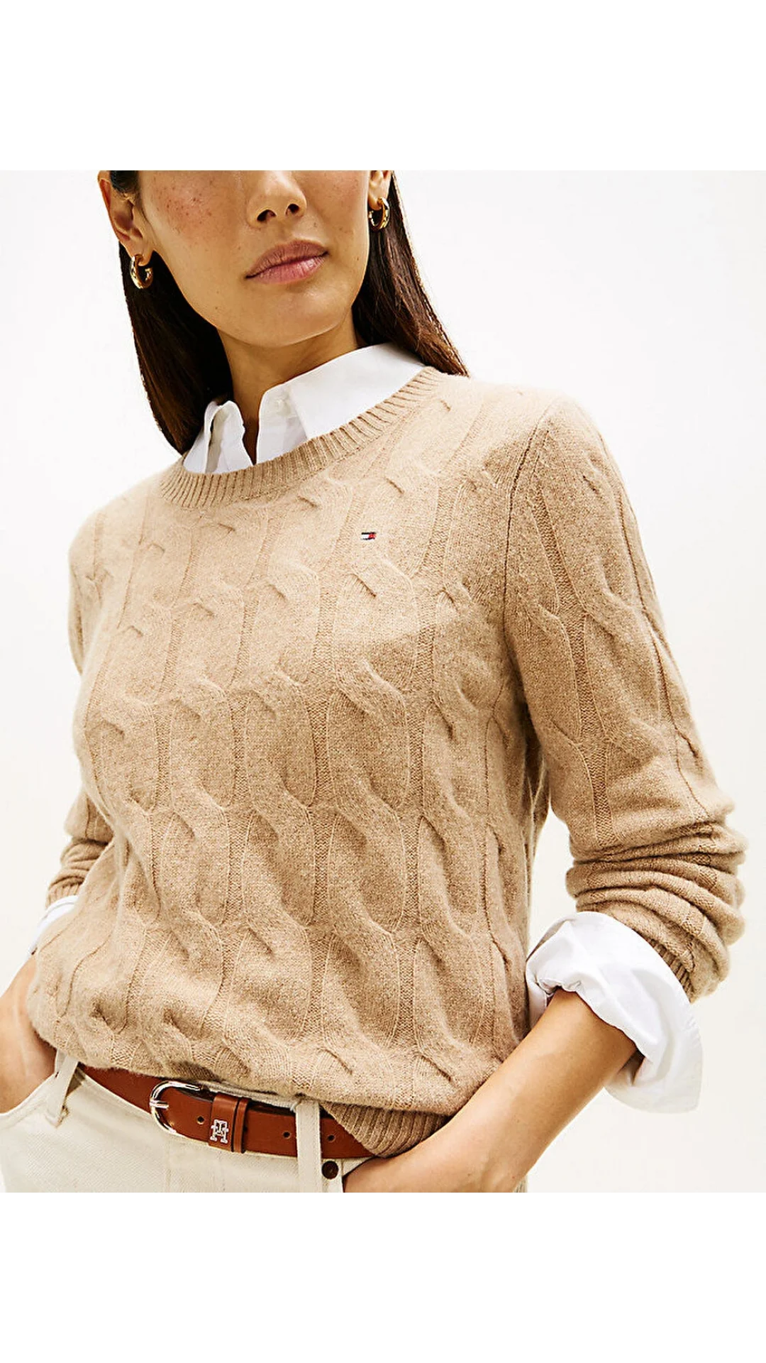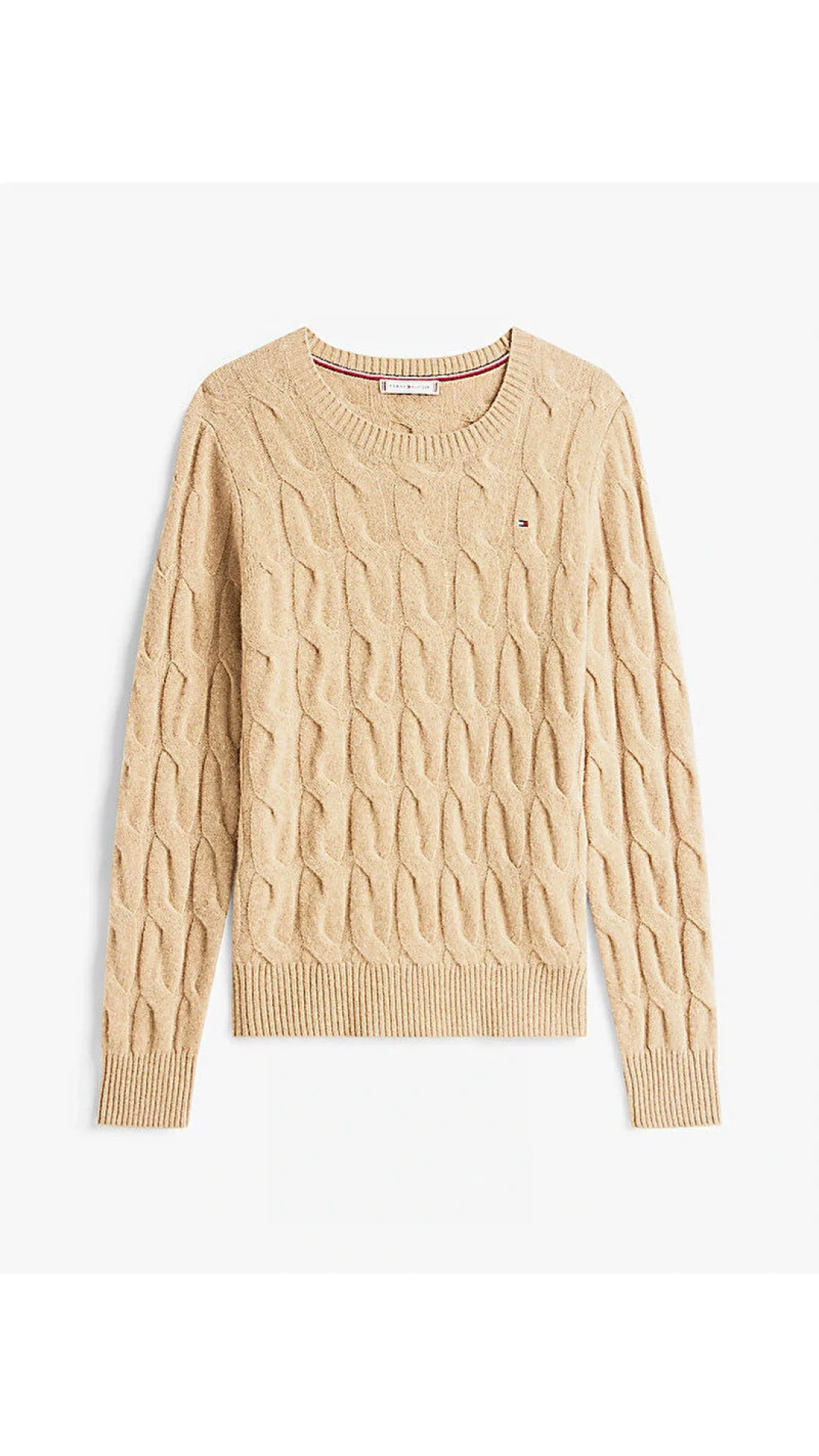 Tommy Hilfiger Yumuşak Yün Saç Örgülü Bisiklet Yaka Uzun Kollu Kadın Bej Kazak WW0WW43586ADM