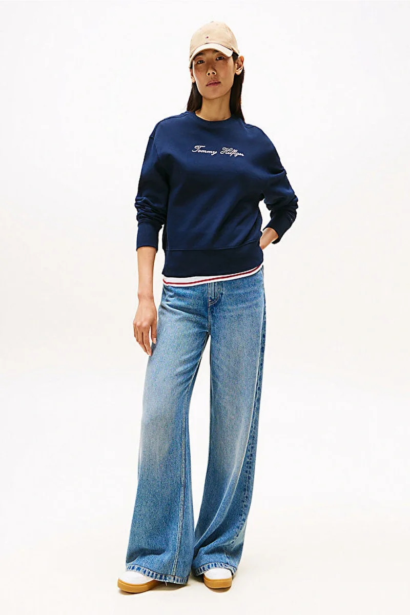 Tommy Hilfiger Kadın Simli Yazı Baskılı Normal Kesim Mavi Kazak WW0WW47159C1G
