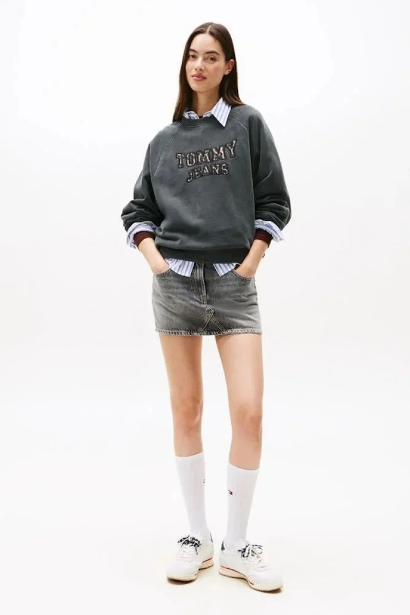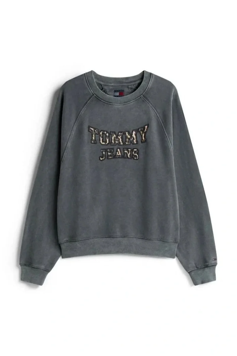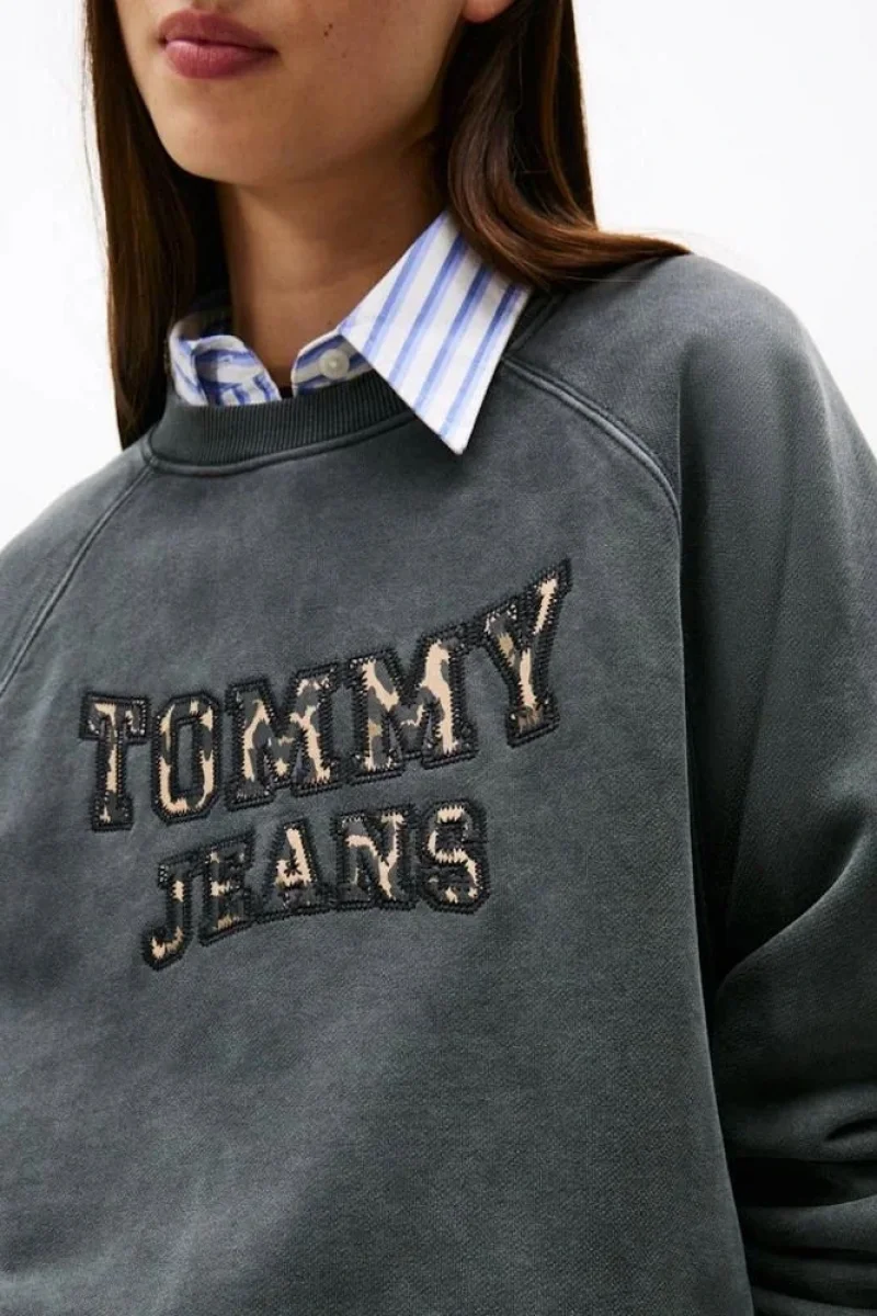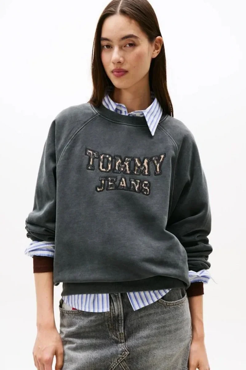 Tommy Hilfiger TJW Kutu Kesim Leopar Desenli Kolej Stili Bisiklet Yaka Kadın Siyah Kazak DW0DW21959BDS