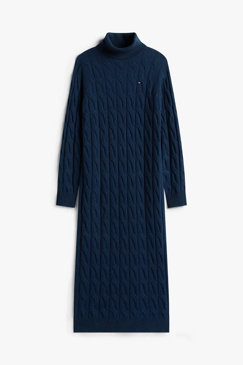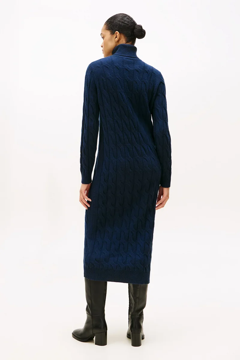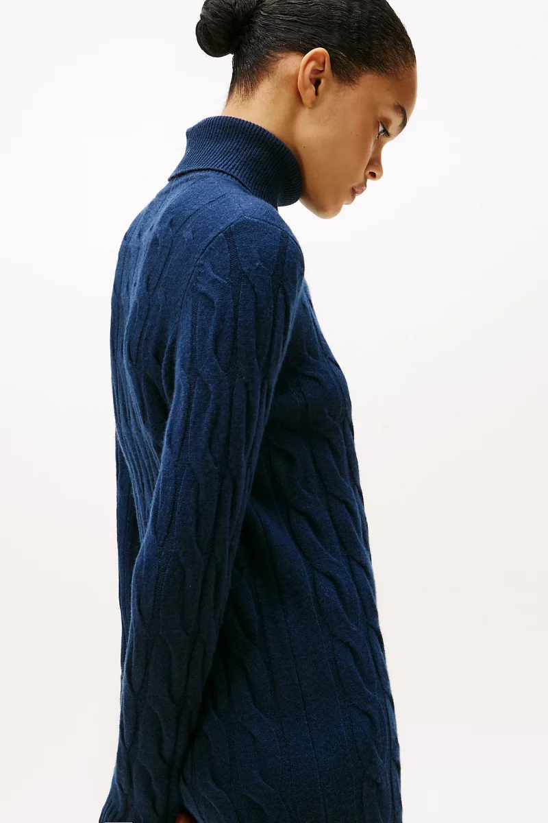 Tommy Hilfiger Yün Kaşmir Karışımlı Saç Örgülü Yarım Balıkçı Yaka Uzun Kollu Kadın Mavi Elbise WW0WW46430C1G