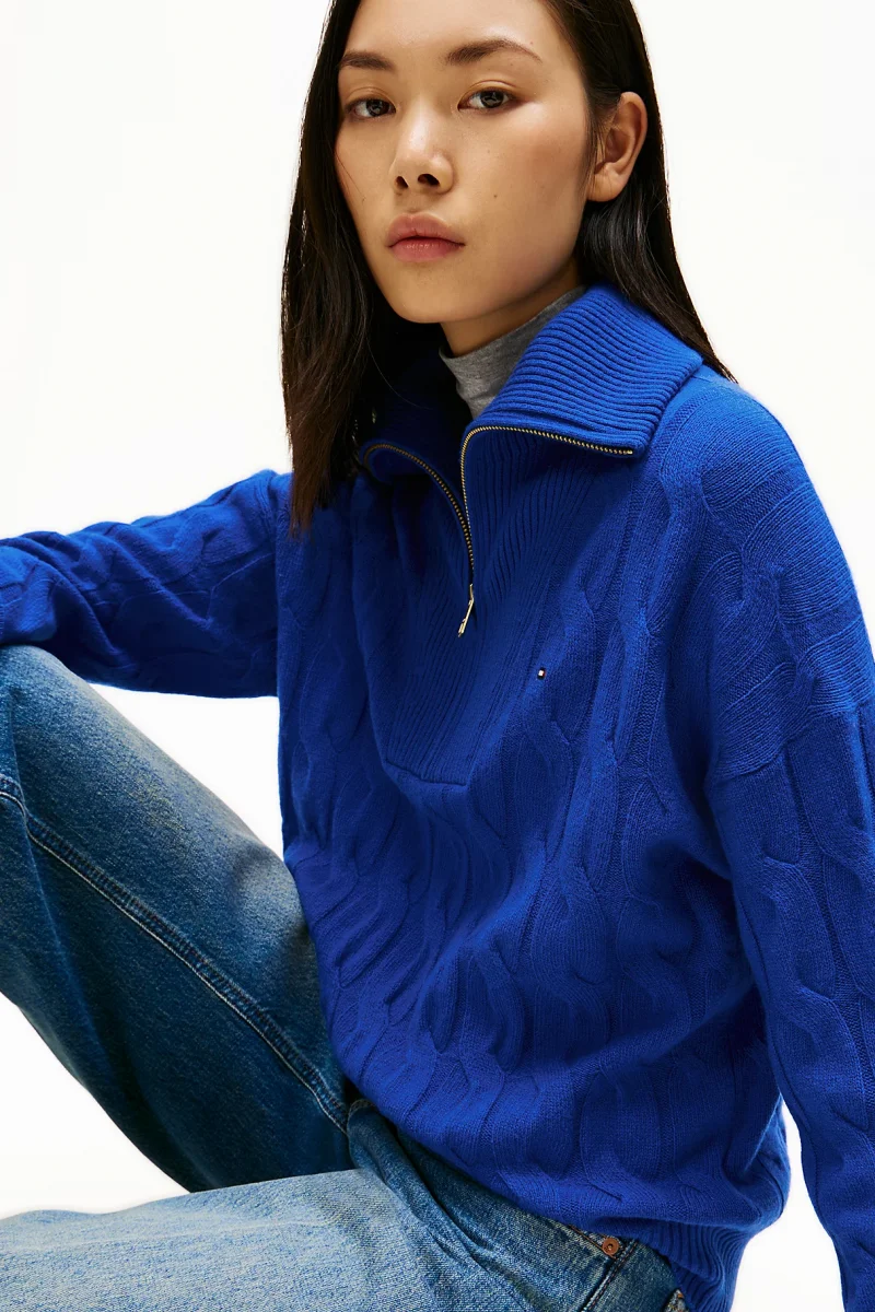 Tommy Hilfiger Yumuşak Yün Saç Örgülü Yarım Fermuarlı Uzun Kollu Kadın Mavi Kazak WW0WW46425C65