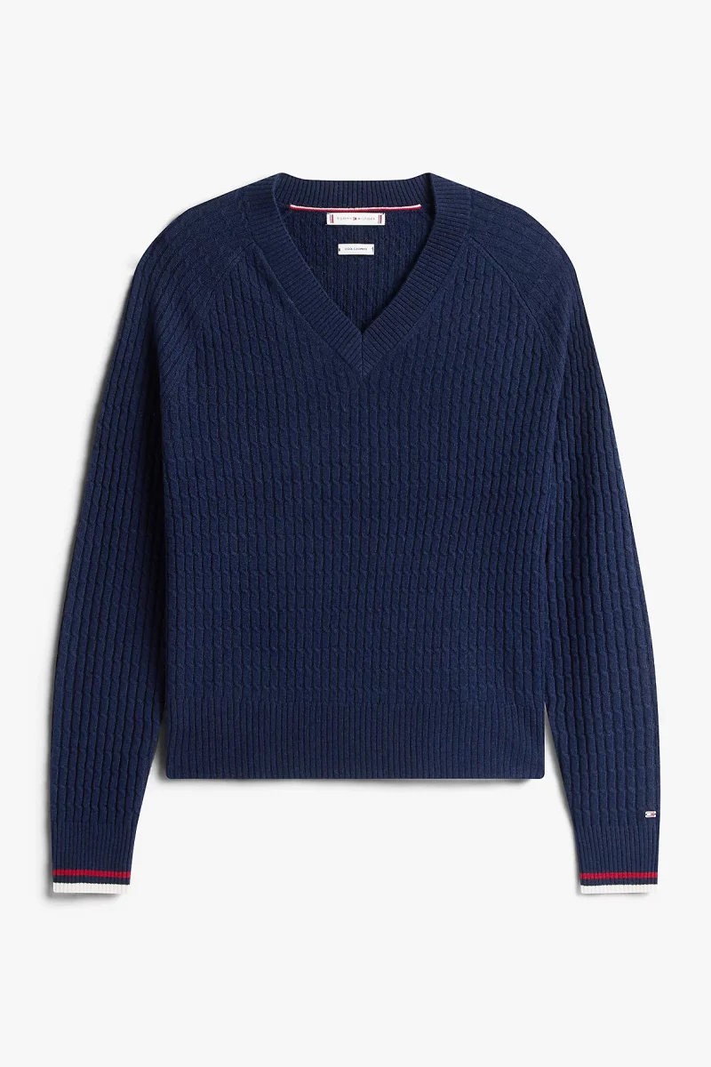 Tommy Hilfiger Yün Kaşmir Karışımlı Saç Örgülü V Yaka Uzun Kollu Kadın Mavi Kazak WW0WW464170Z0